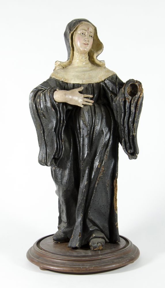 Scultura in legno policromo scolpito raffigurante Santa con occhi in vetro. Genova, XVII secolo. H. cm. 68. (mancanze).