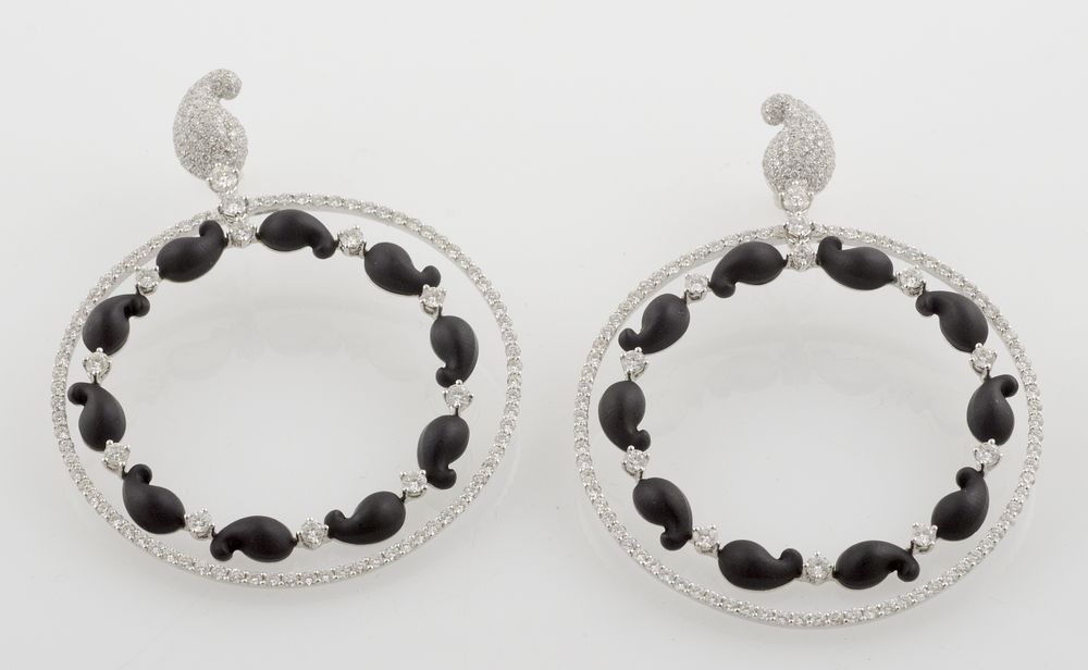 Orecchini a cerchio in oro bianco con diamanti taglio brillante all'interno 20 giaetti satinati alternati da diamanti , ca tot ct 5,50