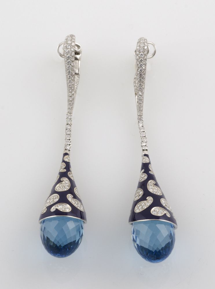 Orecchini pendenti in oro bianco con smalto blu e finale di topazio a goccia briolette. Ca tot ct 1.60