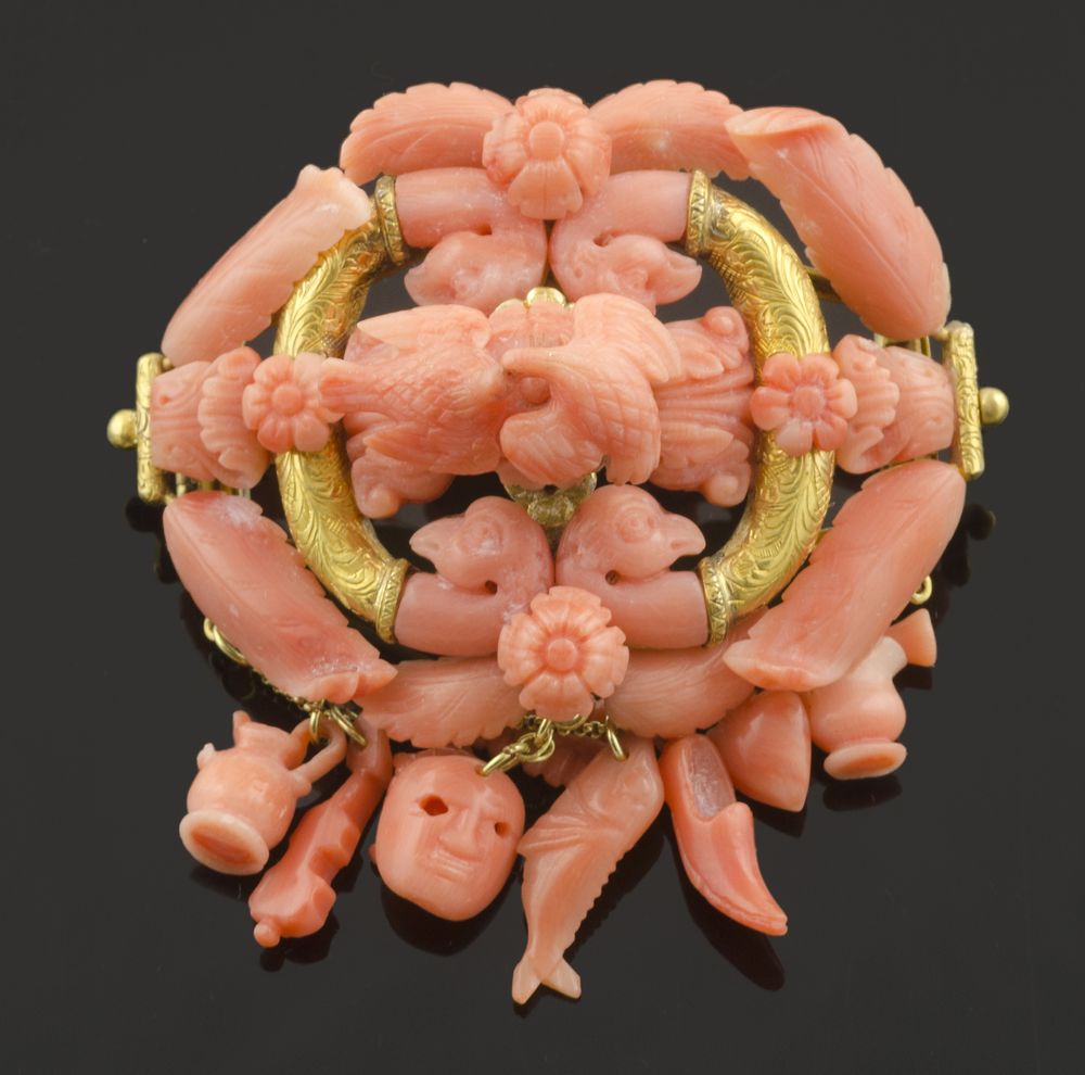 Spilla "napoletana" in corallo e oro giallo finemente lavorata. gr. 34.