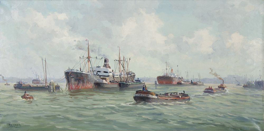Peter Johannes Wagemans 1879-1955 "Traffico di barche in mare" cm. 43x80 - olio su tela Firmato b. a s.