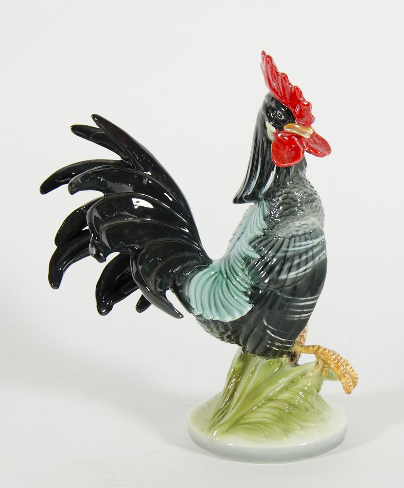 Ronzan: scultura in ceramica poliroma raffigurante gallo. Firmata sotto la...