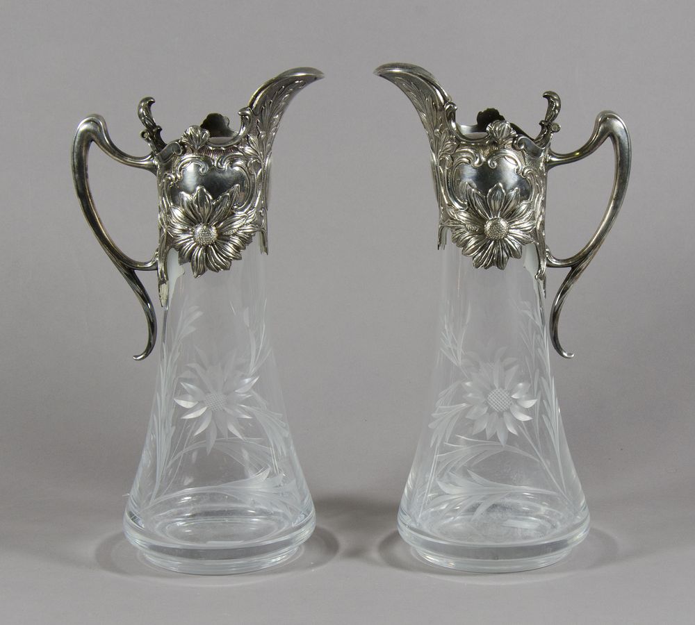 Coppia di brocche in cristallo inciso con montatura in metallo sbalzato e...