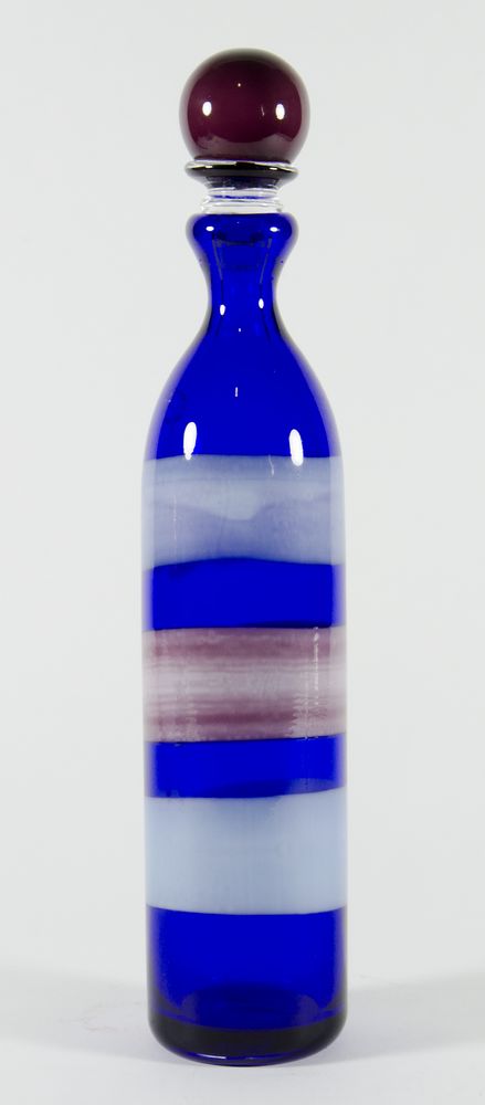 Venini: grande bottiglia con tappo in vetro blu con fasce decorate. Firma...