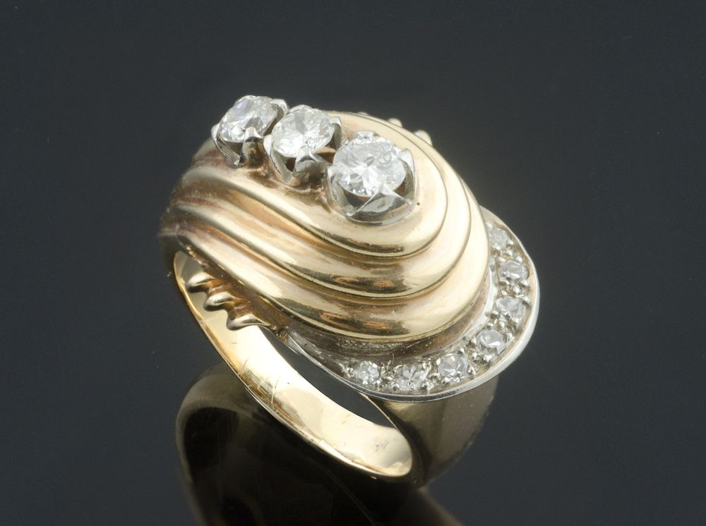 Anello in oro giallo a cupola con 3 diamanti taglio brillante per ca tot ct 0,40, anni '40