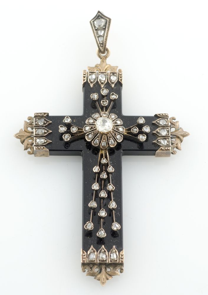 Croce/ciondolo in onice, oro e brillanti. Fine XIX secolo.