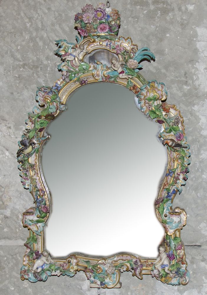 Specchiera da parete con cornice in porcellana policroma decorata a motivi floreali e di uccelli. Meissen (?). cm. 70x44. (mancanze).