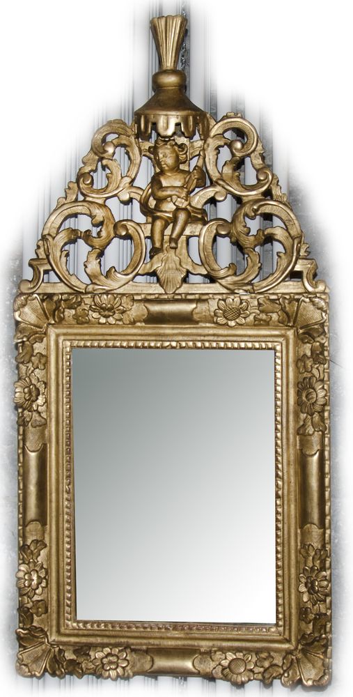 Specchiera in legno dorato con cimasa finemente scolpita e figura di putto...