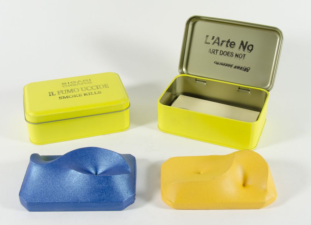 Giuseppe Amadio 1944 "Art deos not" Lotto di 2 tele estroflesse entro scatole in latta. Firma stampata. cm. 6x15x10.