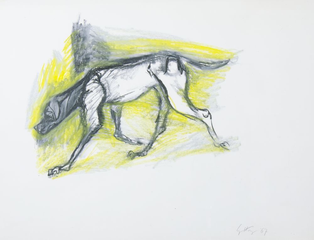 Renato Guttuso Bagheria 1912-Roma 1987 "Cane nella campagna romana" cm. 44x58 - tecnica mista su carta Firmato b. a d. e datato '67. Al retro: etichetta Galleria del Girasole Udine; timbro Galleria Colussa Udine.