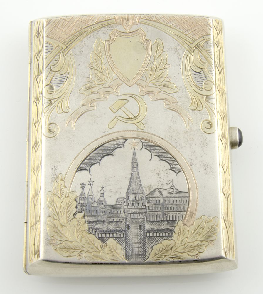 Scatola portasigarette in argento con coperchio inciso e dorato rafigurante...