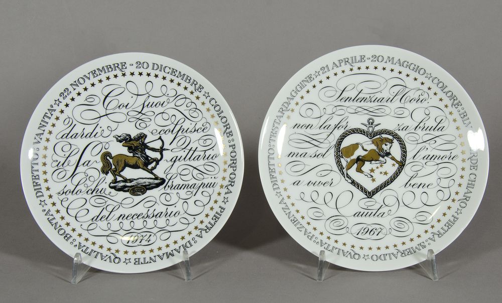 Piero Fornasetti Lotto di 2 piatti decorati della serie Zodiaci. Firmato sotto la base. Diam. cm. 21.