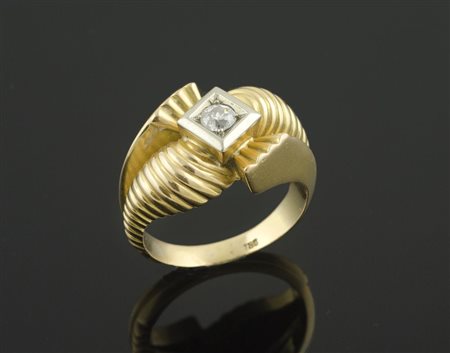 Anello in oro giallo con diamante centrale per ca ct 0,20, anni '40