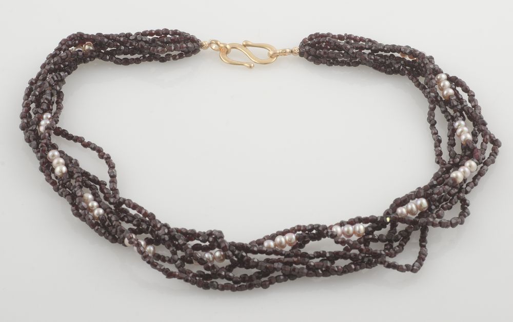 Collana girocollo composta da 7 fili di granati sfaccettati e perle con chiusura in argento dorato
