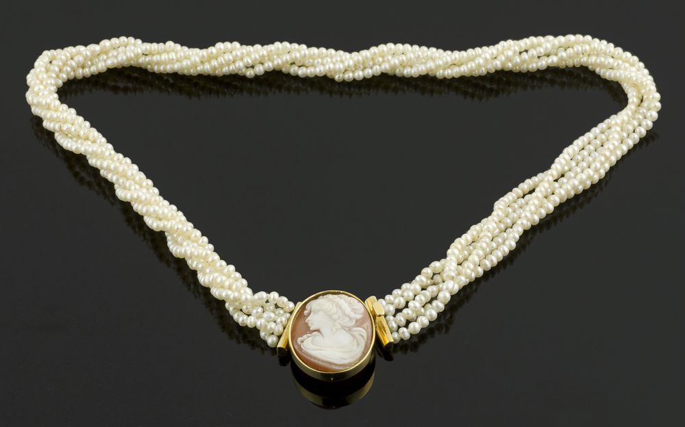 Collier composto da 5 fili di microperline con chiusura in oro giallo e cammeo centrale.
