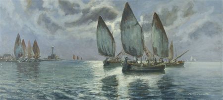 Mario Ticulin attivo a Trieste nel ‘900. "Notturno sul mare" cm. 50x110 -...