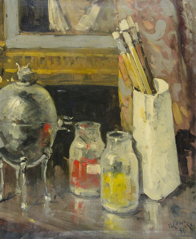 Mario Capuzzo Polesine 1902-Ferrara 1973 "Interno di studio" cm. 60x50 - olio su tela Firmato b. a d. e datato '44.