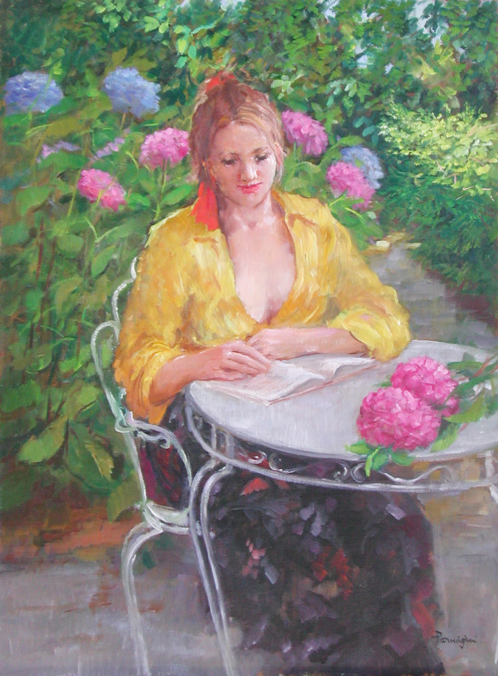 Parmigiani Aldo in giardino 2010 olio su tela 60x80 autentica dell'artista su foto