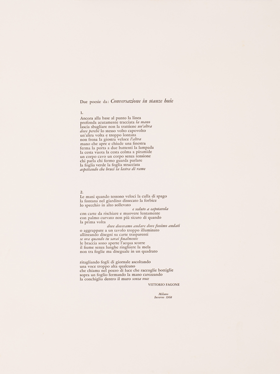 Entro cartella originale con colophon di presentazione con due Poesie di Vittorio Fagone e con dedica ad personam dell'Artista