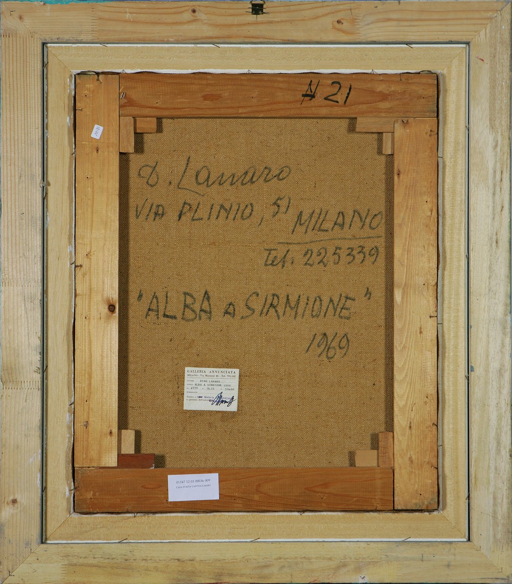LANARO DINO (1908 - 1998) Alba a Sirmione. 1969 Olio su tela, cm 50x60. Opera pubblicata a pagina 16 del catalogo (allegato all'opera) Lanaro trent'anni di pittura a cura di Guido Perocco, Edizioni Annunciata. Firma e anno in basso a sinistra. Al retro firma, titolo e anno. Cartiglio della Galleria Annunciata, Milano. Cornice presente.