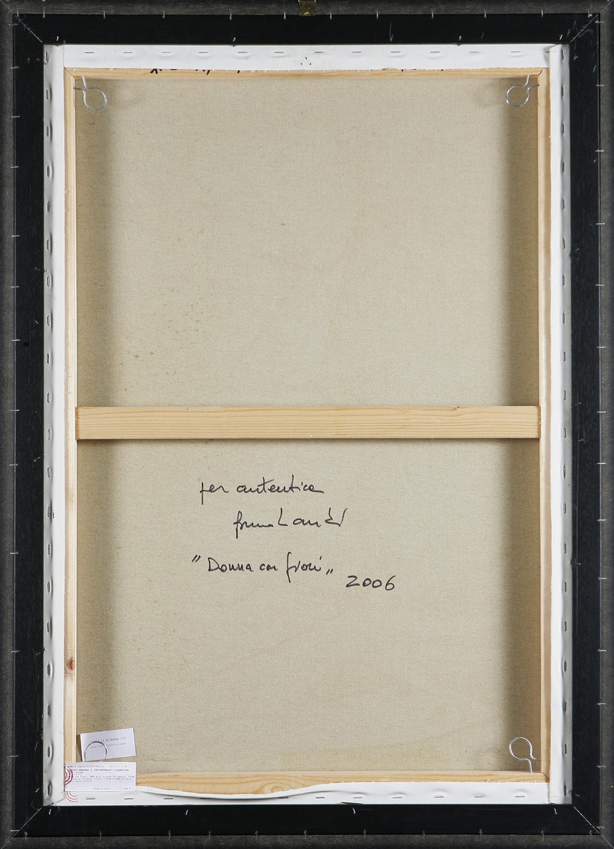 LANDI BRUNO (n. 1941) Donna con fiori. 2006 Olio su tela, cm 70x100. Autentica dell'artista su fotografia. Firma in basso a sinistra. Al retro autentica dell'artista, titolo e anno. Cornice presente.