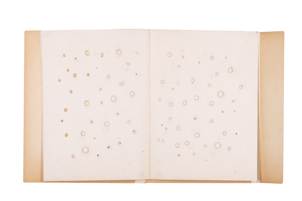 Cofanetto contenente un quaderno di 14 fogli lavorati dall'Artista con bruciature, applicazioni e acquerello