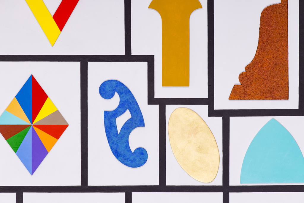 Collage, colore acrilico, smalto, oro in foglia, e sabbia su legno