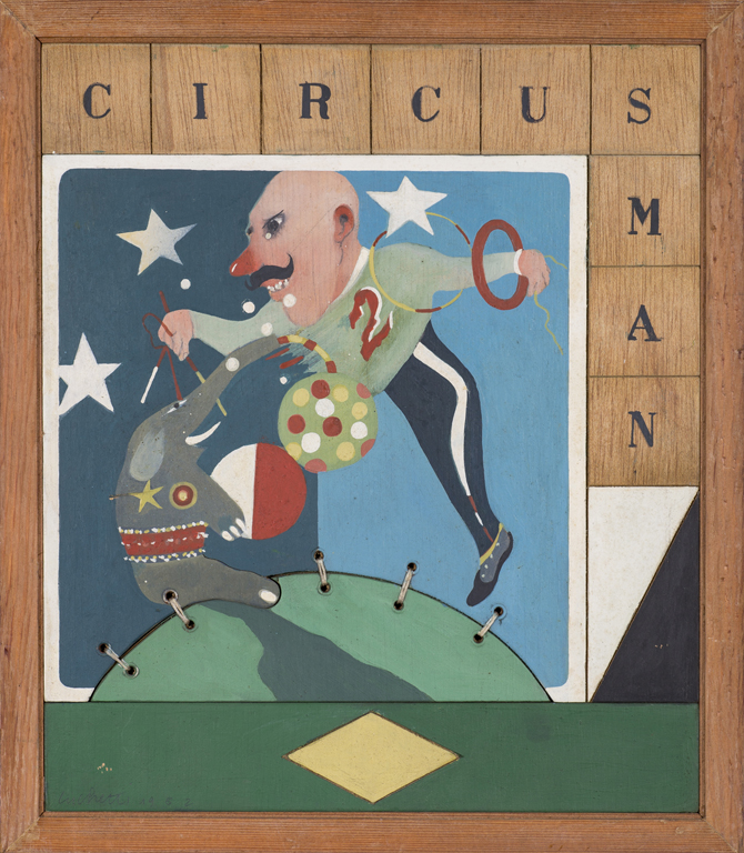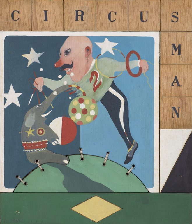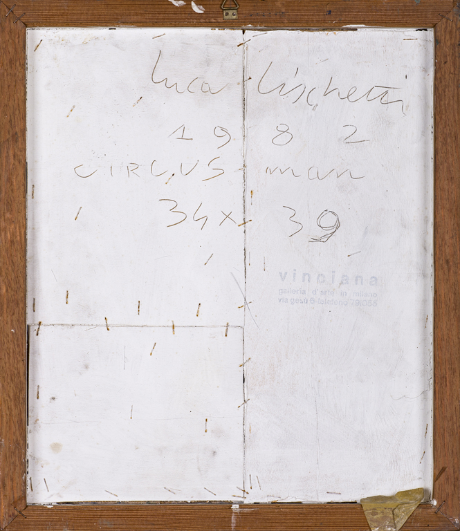 LUCA LISCHETTI (1950)Circus Man, 1982Intarsi su tavola di legno dipinto entro...