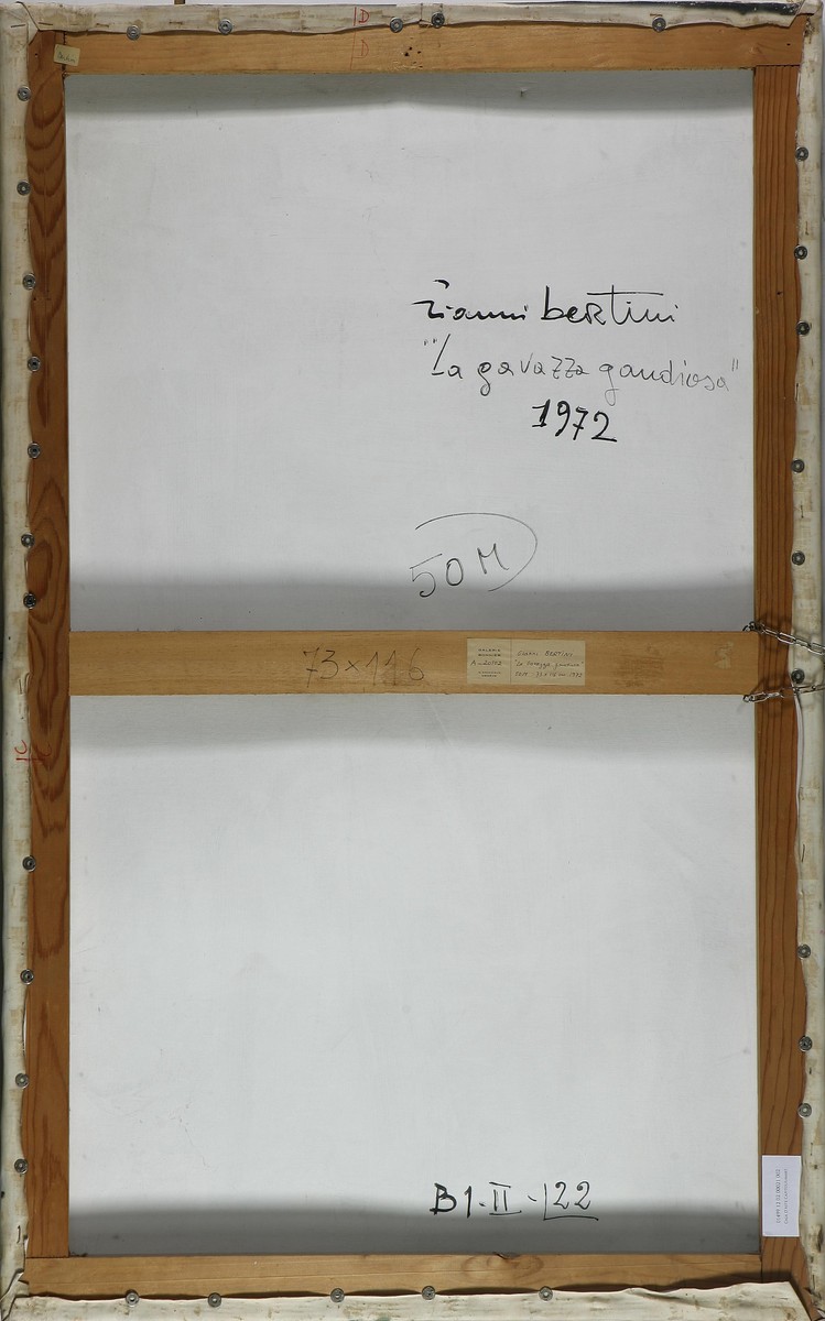 BERTINI GIANNI (1922 - 2010) La gavazza gaudiosa. 1972 Acrilico su tela, cm 116x73. Autentica su fotografia a cura dell' Archivio Frittelli per l'opera di Gianni Bertini, Firenze, con relativo numero di archiviazione. Firma e data in basso al centro. Al retro firma, titolo e anno. Cartiglio descrittivo della Galerie Bonnier di Ginevra, con relativo numero d'archivio. Opera archiviata presso l'archivio delle opere di Gianni Bertini, presso "Frittelli Arte" (FI) come da documentazione fotografica allegata riportante numero d'archivio.