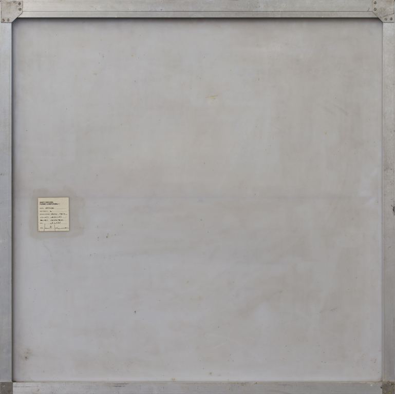 Etichetta dell'Artista con firma, titolo, misure, materiali impiegati e datazione al retro