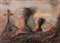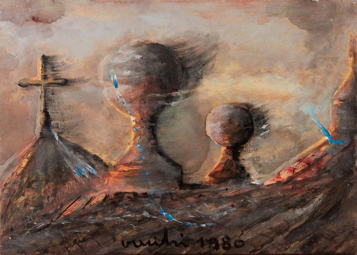 Sergio Vacchi (Castenaso 1925 – Siena 2016), “Vento azzurro di Roma attraverso la croce e i globi di pietra”, 1980. Olio su tela, firmato e datato in basso al centro Vacchi 1980, firmato, titolato e datato al retro ‘Vento azzurro di Roma attraverso la croce e i globi di pietra – Vacchi 1980’, H cm 50x70