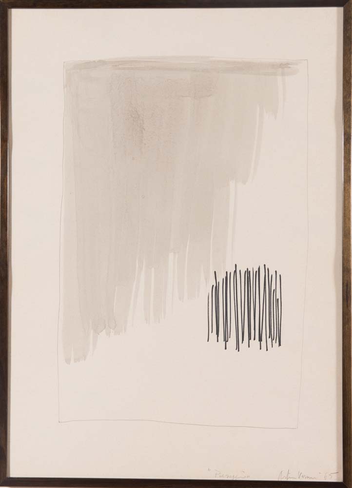 Arturo Vermi (Bergamo 1928 – Lecco 1988), “Paesaggio”, 1965. Tecnica mista su carta, firmato, titolato e datato in basso a destra ‘Paesaggio’ Arturo Vermi 65, H cm 70x50