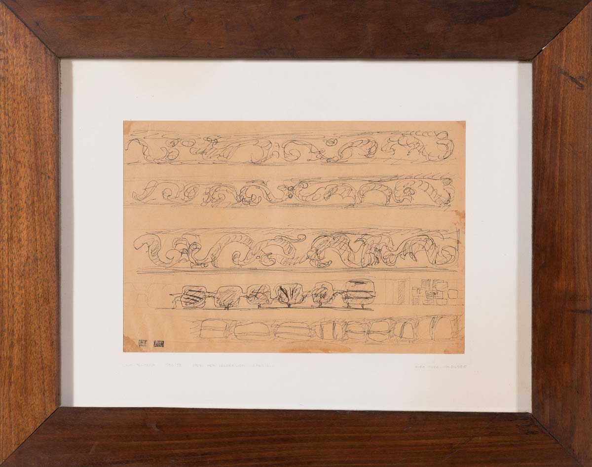Lucio Fontana (Rosario Santa Fe 1899 – Varese 1968), “Studi per decorazioni spaziali”, 1950/52. Biro nera su carta, firmato, datato e titolato in basso a sinistra ‘Lucio Fontana 1950/52 Studi per decorazioni spaziali’, in basso a destra reca tecnica e misure ‘biro nera – cm 21x29.5’, H cm 21x29.5 Al retro Catalogazione Fondazione Lucio Fontana 3316-1