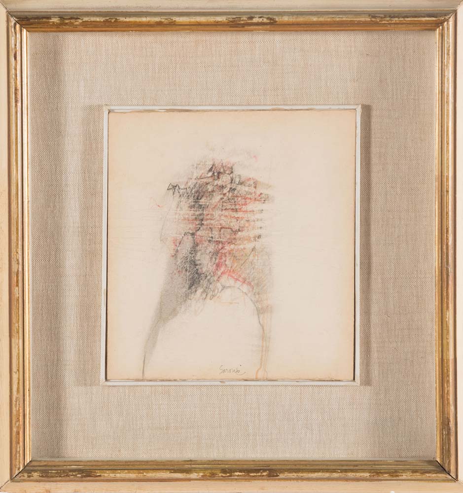Sergio Saroni (Torino 1935 – 1991), “Figura”, Anni '50. Pastello su carta, firmato in basso al centro Saroni, H cm 16.5x12.5 Reca etichette al retro: Galleria Pogliani – Roma; Galleria d’Arte La Vernice – Bari – Mostra Piccolo Formato del 1962; Galleria Penelope – Roma; Galleria La Bussola – Torino