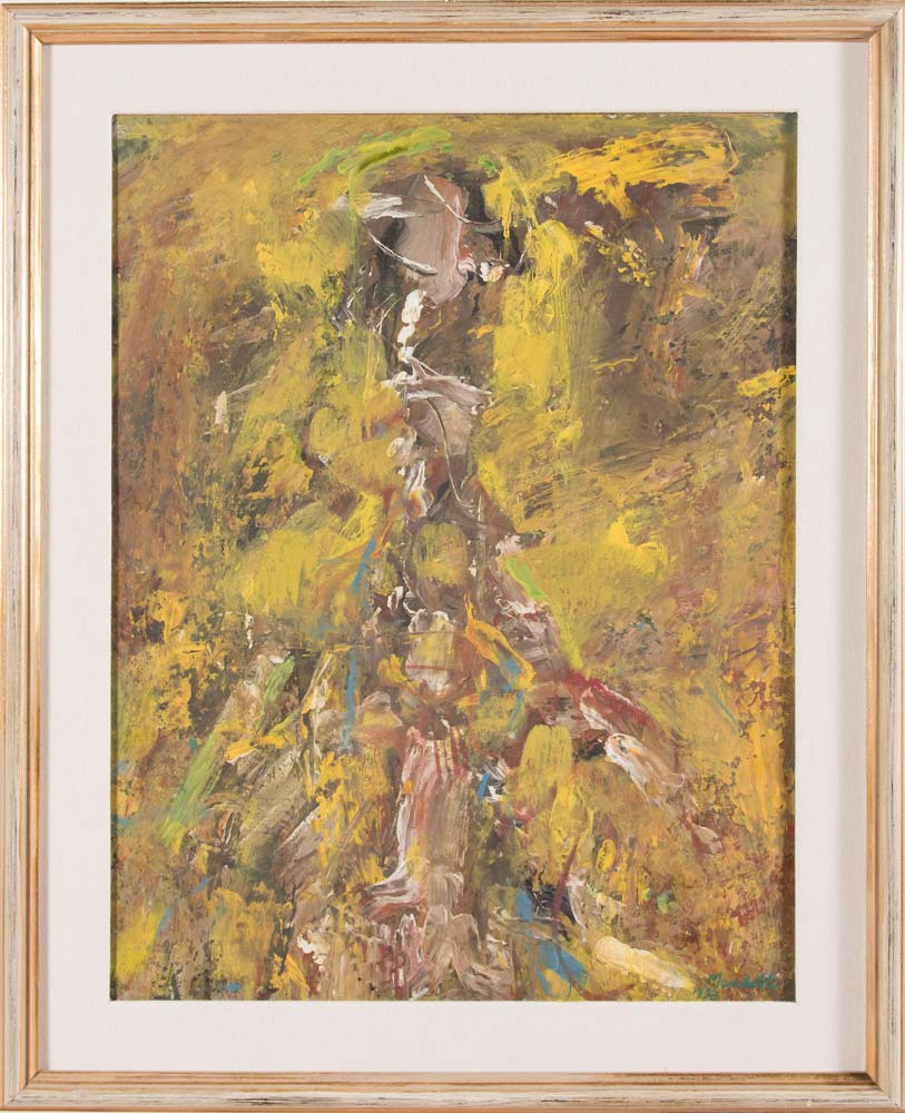 Pompilio Mandelli (Reggio Emilia 1912 – Bologna 2006), “Figura nel bosco”, 1958. Acrilico su carta riportata su tela, firmato e datato in basso a destra Mandelli 1958, firmato datato e titolato al retro, H cm 50x65 Reca timbro ed etichetta al retro Galleria d'Arte Paolo Nanni – Bologna