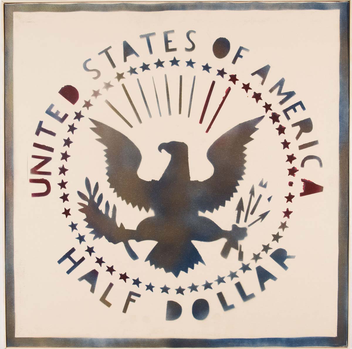 Franco Angeli (Roma 1935 – 1988), “Antipittura (Half Dollar)”, Anni ‘80. Tecnica mista e vernice spray su tela, firmato al retro Angeli e timbro ANTIPITTURA, H cm 70x70 (difetto) Opera in fase di archiviazione presso l'Archivio Franco Angeli – Roma