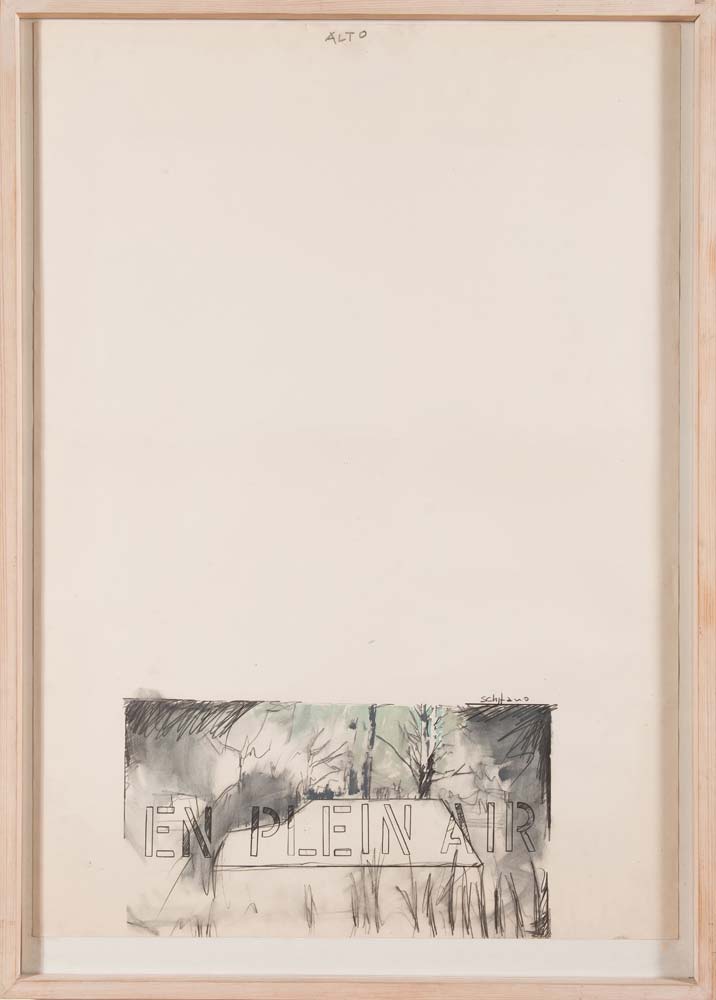 Mario Schifano (Homs 1934 - Roma 1998), “En Plen Air”, 1963. Tecnica mista su carta, firmato in basso a destra Schifano, H cm 100x70. Reca etichetta al retro Galleria de' Foscherari Bologna