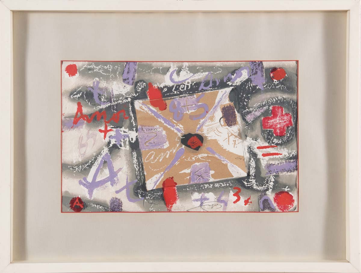 Antoni Tapies (Barcellona 1923 – 2012), “Lettera d'amore”, 1985. Collage e litografia su carta di riso, firmata e numerata in basso al centro 10/75 Tapies, H cm 32x46 Provenienza: coll. Carlo Cattelani (Modena) – iscrizione al retro