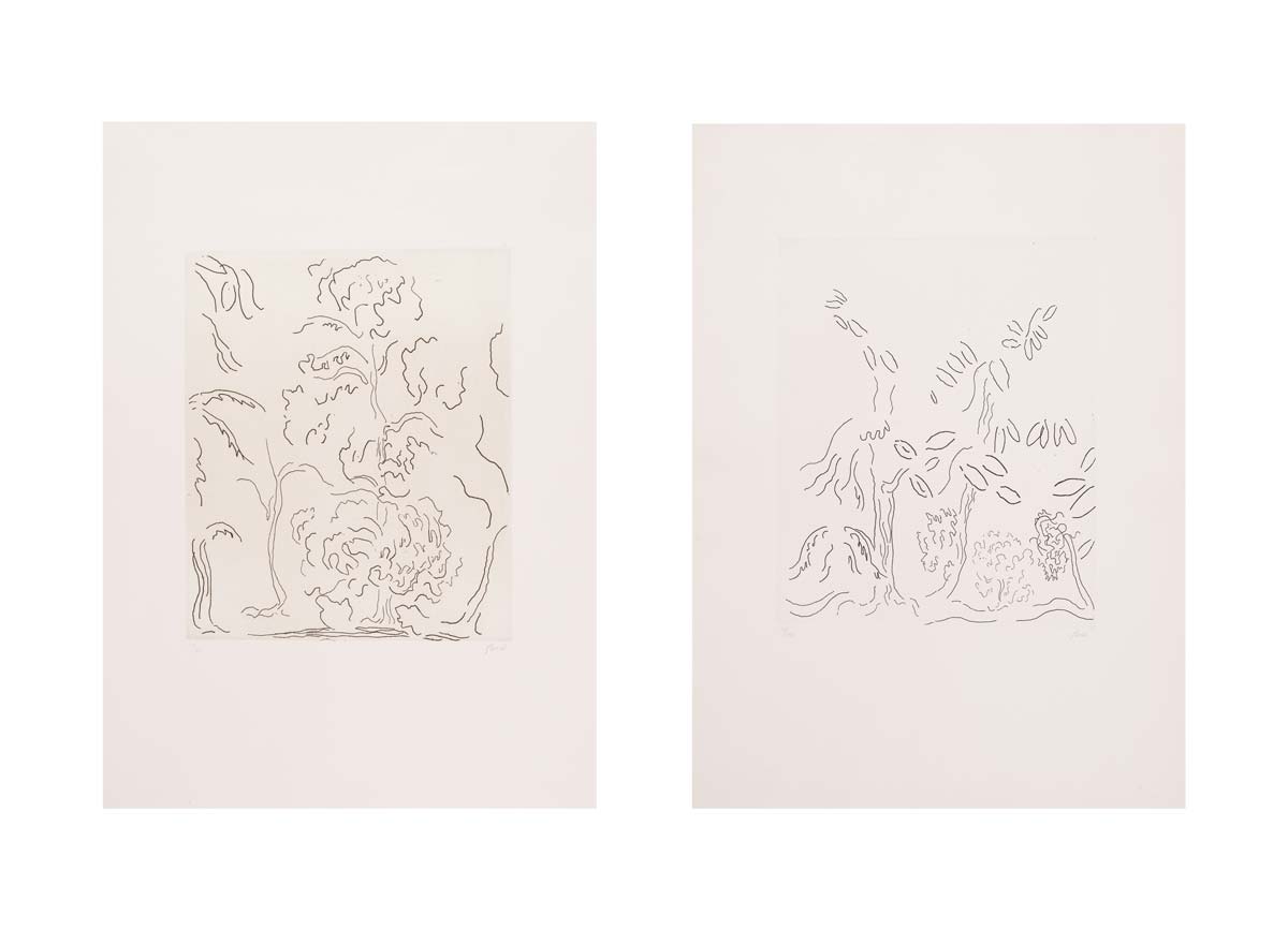 Virgilio Guidi (Roma 1891 – Venezia 1984), Coppia di incisioni, Anni ‘70. “Alberi”, firmata in basso a destra Guidi, numero di tiratura in basso a sinistra 50/100, H mm 385x320. “Alberi”, firmata in basso a destra Guidi, numero di tiratura in basso a sinistra 30/80, H mm 385x320