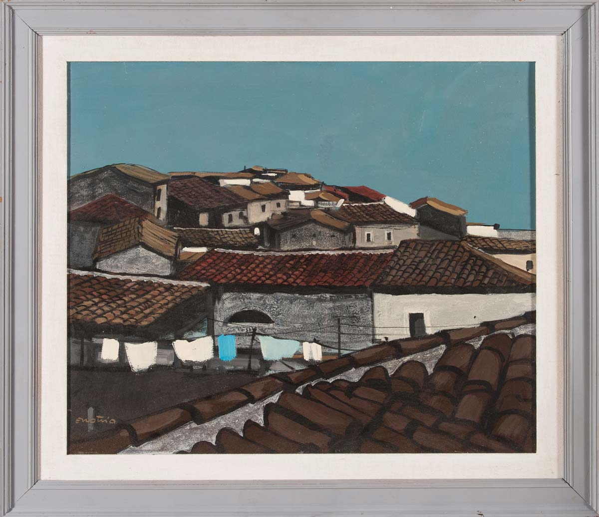 Enotrio Pugliese (Buenos Aires 1920 – Pizzo 1989), “Paesaggio calabrese”. Olio su tela, firmato in basso a sinistra Enotrio, al retro firme e titolo Enotrio - ‘Paesaggio calabrese’, H cm 70x60 Al retro reca timbro Galleria La Barcaccia – Napoli
