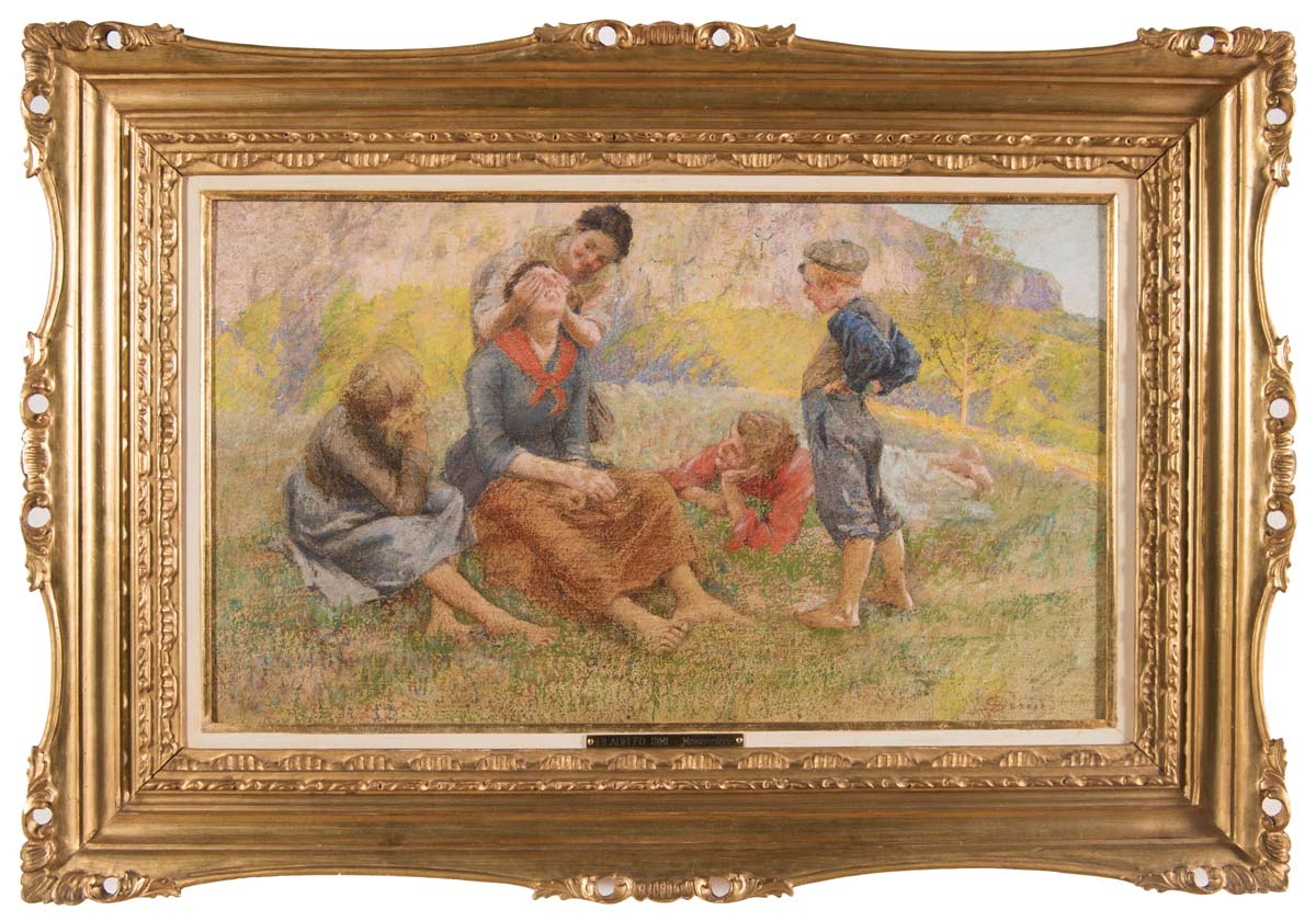 Filadelfo Simi (Levigliani 1849 – Firenze 1923), “Moscacieca”. Olio su tavola di cartone rigido, firmato in basso a destra F Simi, al retro reca titolo e cartiglio ‘Raccolta F.C. - Filadelfo Simi - “Moscacieca” - N.50’, H cm 36x59