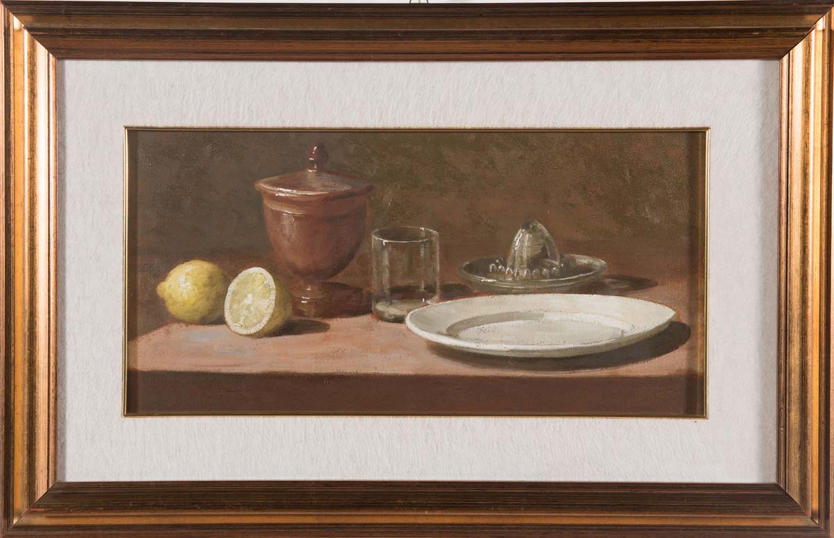 Piero Fiori (Bologna 1947), “Natura morta”. Olio su tela tamburata, firmato in basso a destra P.Fiori, opera firmata e titolata al retro ‘Natura morta’ - Piero Fiori, H cm 25.5x50