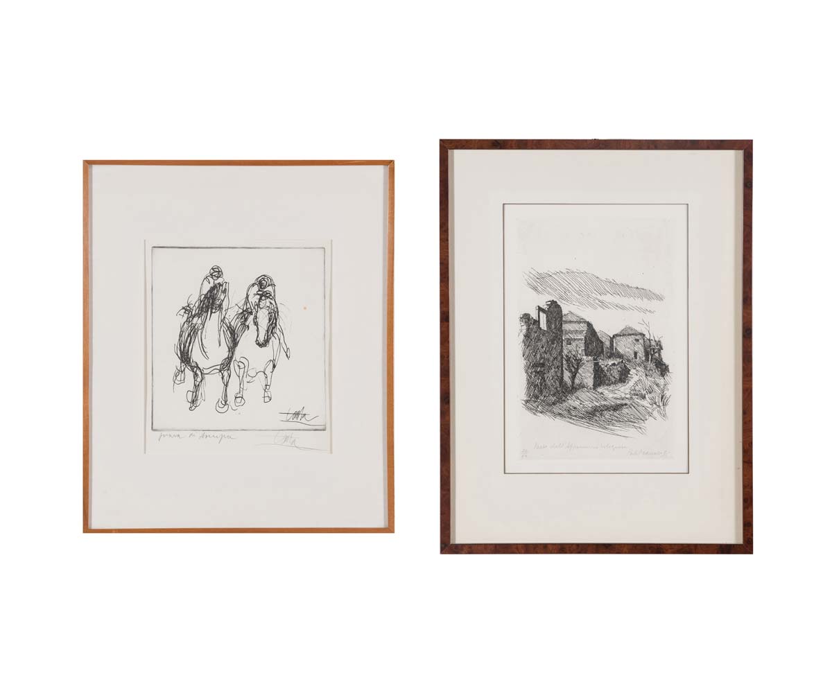 Cleto Tomba (Castel San Pietro 1898 – Bologna 1987) – Paolo Manaresi (Bologna 1908 - 1991), Coppia di Litografie. Tomba: “Due fantini a cavallo”, litografia, firmata in basso a destra Tomba, esemplare prova di stampa, H mm 220x205. Manaresi: “Paese dell’Appennino Bolognese”, litografia, firmata in basso a destra Paolo Manaresi, titolata in basso al centro ‘Paese dell’Appennino Bolognese’, numero di tiratura in basso a sinistra 29/99, H mm 305x195