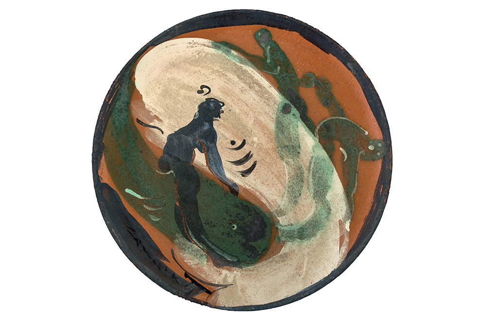Piatto in terracotta ingobbiata decorata a mano sottovernice, monotipo, Manifattura Giuseppe Mazzotti 1903, Albisola