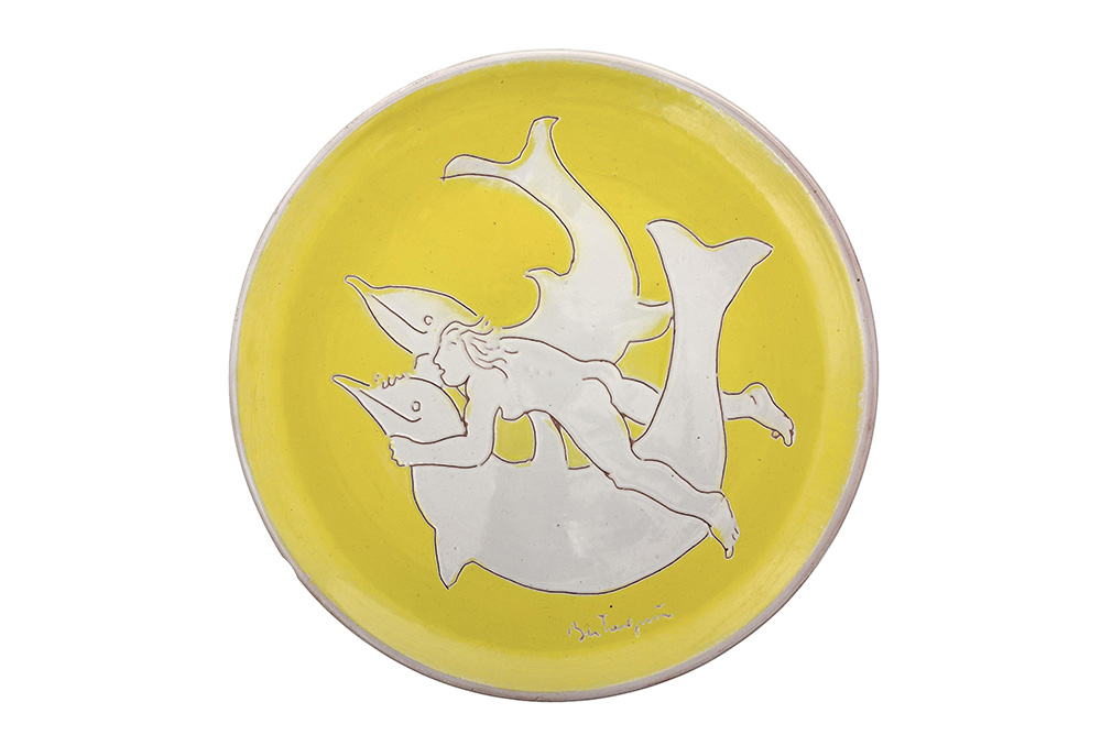 Piatto in terracotta maiolicata decorata a mano con graffiture, monotipo, Manifattura Giuseppe Mazzotti 1903, Albisola