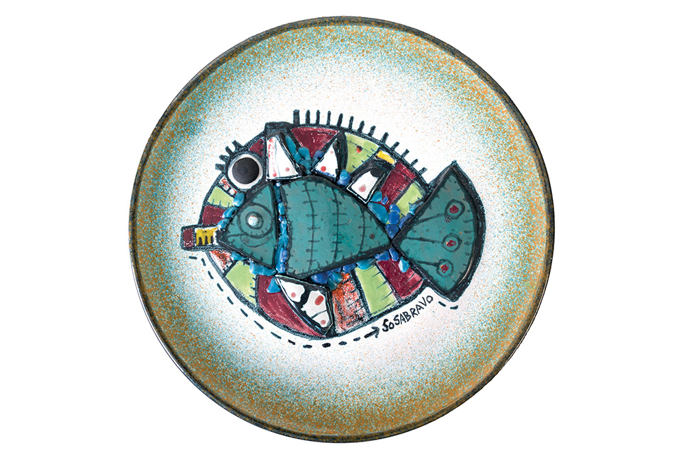 Piatto in terracotta maiolicata decorata a mano con inserti, monotipo, Manifattura Giuseppe Mazzotti 1903, Albisola
