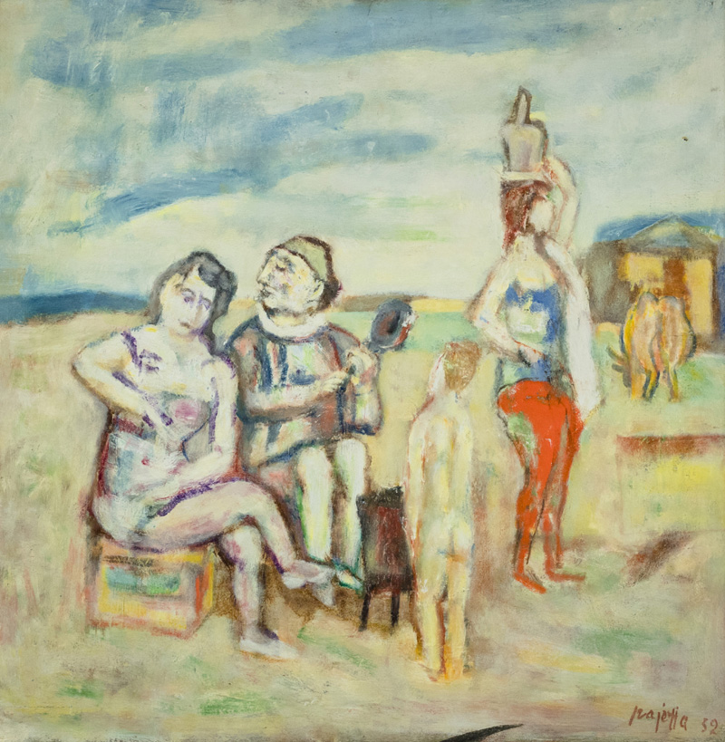 Guido Pajetta (Monza 1898 Milano 1987) Il riposo dei circensi 1952 Olio su tavola, cm. 58x58. Firma e data in basso a destra. Autentica di Giorgio Pajetta, su foto con Archivio n° 2771.