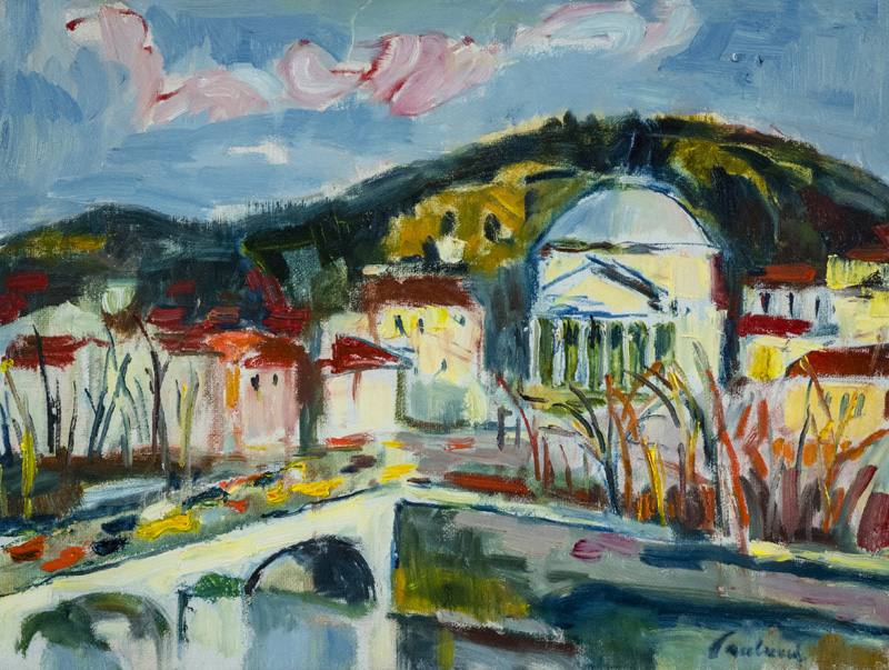 Enrico Paulucci (Genova 1901 Torino 1999) La Gran Madre-Torino Olio su tela, cm. 30x40. Firmato in basso a destra. Sul verso: firma e titolo. Autentica dell'Artista su foto.