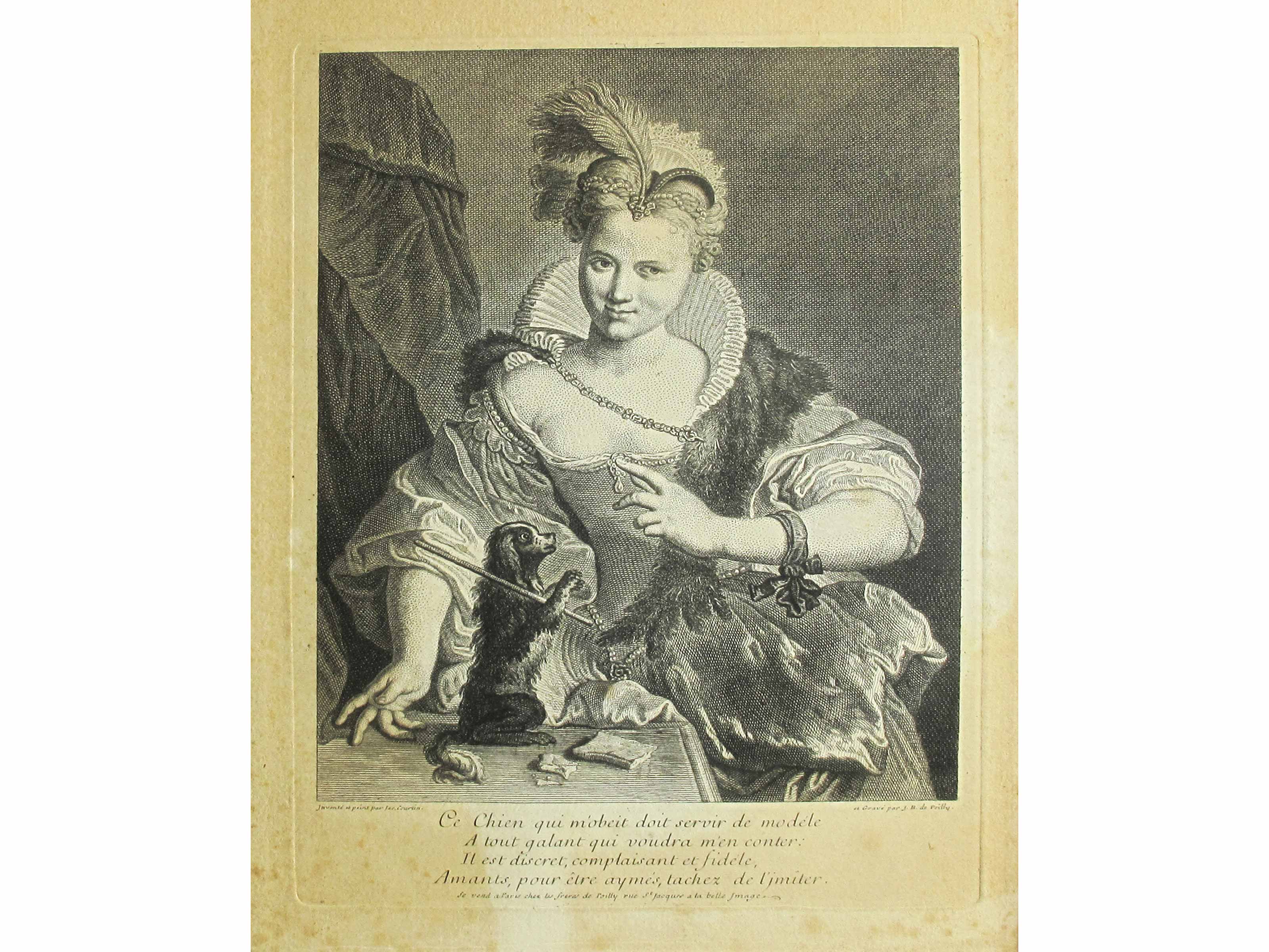 Ritratto di dama con cagnolino di Nicolas Jean-Bapt. Poilly (1712-1758). 29x21.3 cm