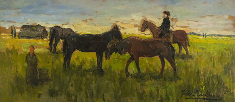 Giovanni Bartolena (Livorno 1866 Livorno 1942) Cavalli al pascolo Olio su tavola, cm. 40x85 Firmato in basso a destra; Sul verso: scritti di provenienza.